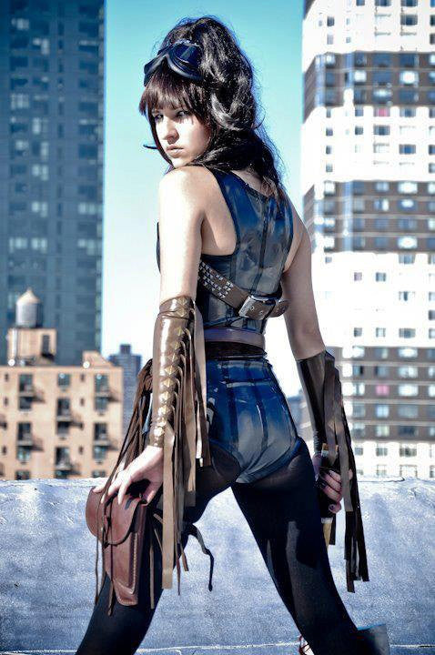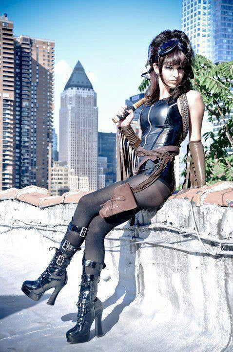 Latex cosplay of the character Blondie from the sexy action movie, Suckerpunch. The costume includes a bodysuit made of black, pewter, and smoke trans rubber, finished with a silver zipper down center-front and black trim all around. Costume also includes brown latex gauntlets with gold button appliqué and brown tassels.