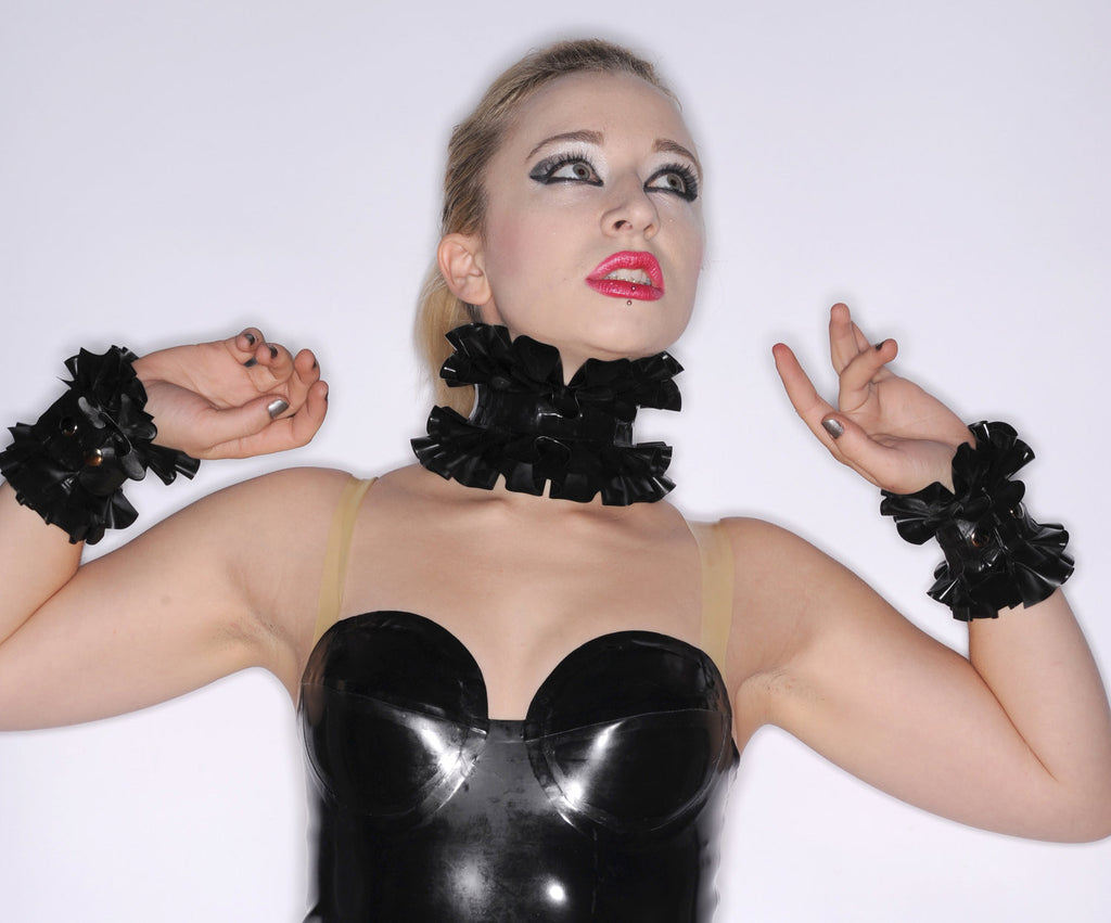 This item is a beautiful hand-crafted latex choker and cuff set made with double rows of latex ruffles. Closes with a row of snaps in the back. Adjustable for almost any neck or wrist size. Shown in black