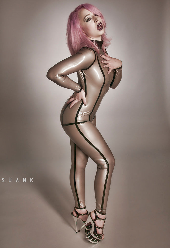 This catsuit is made-to-measure for a perfect fit, constructed with a princess seam base to hug all the curves and detailed with contrast trim on every seam. Also features a 3-way zipper that runs from the back through to the crotch for easy dressing and convenient crotch access. Shown in semi-trans metallic silver with black trim. Available in any color combo! Get kinky and creative ;)