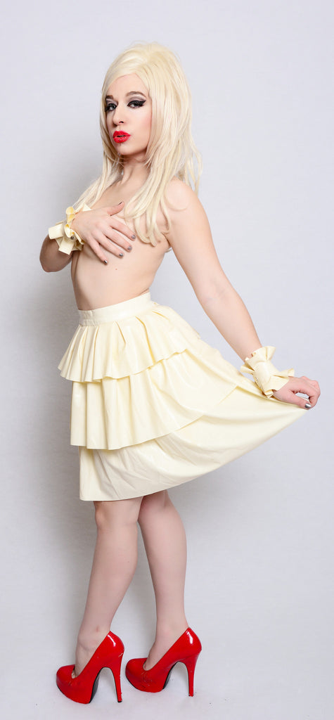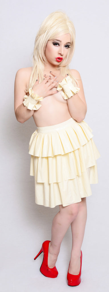 This adorable skirt has a beautiful silhouette, with three tiered layers of pleated ruffles cascading down to the knees with a high waist-band. Shown in white, this versatile piece looks amazing in any color.