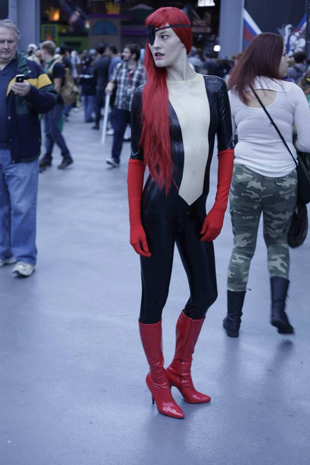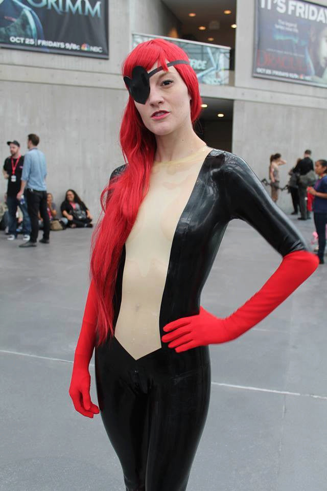 Latex cosplay of Molotov Cocktease from The Venture Brothers on Adult Swim. Listing includes a full body black catsuit with transparent center-front and center-back panels for the deep cut illusion while keeping everything in place! Closes with a short zipper in the back and has a seperate black crotch zipper. Also comes with black latex heart-shaped eye patch. Red gloves, boots, and belts are not included.