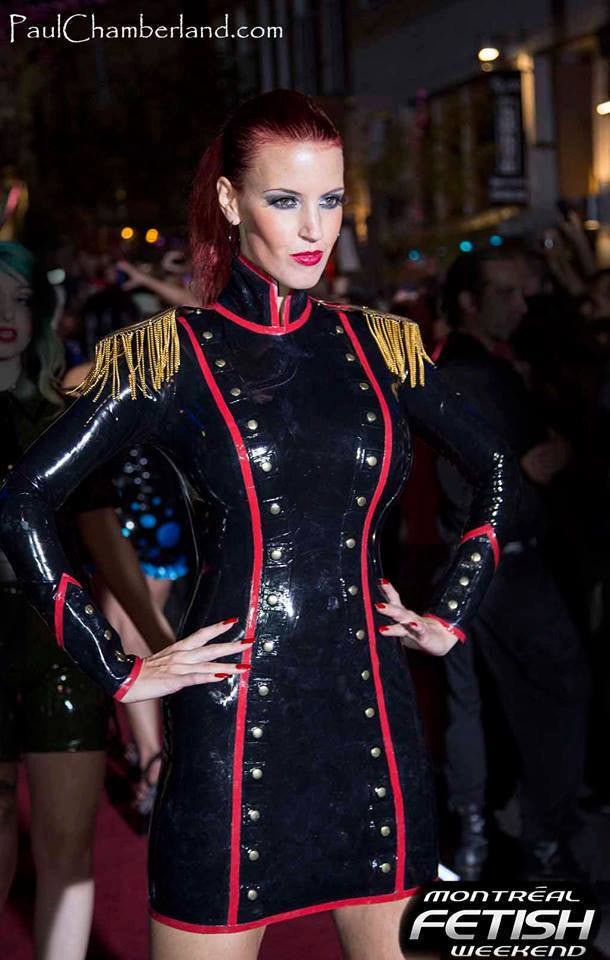 This dress is from our new collection, Discipline, inspired by classic military uniforms with a kinky twist. This stunning dress features form-fitting princess seams, decorative snap details, contrast trim, reinforced stiff collar, and our intricate chain fringe shoulder-pads which use real metal chain and are detachable with functional snaps. Finished with a back zipper for easy dressing. Shown in black with red and gold details.