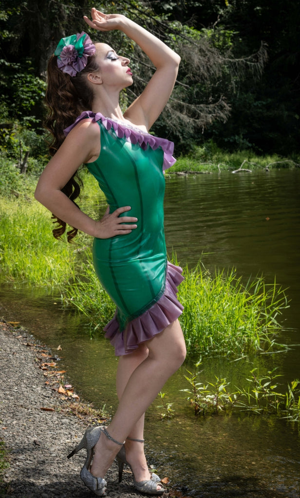 This romantic dress is a must-have for any wardrobe. The unique asymmetrical neckline and hem is accented with luscious ruffles that wrap around the body and hug every curve for a truly stunning silhouette. Shown here in semi-transparent emerald and lilac. Closes with invisible zipper in the back.