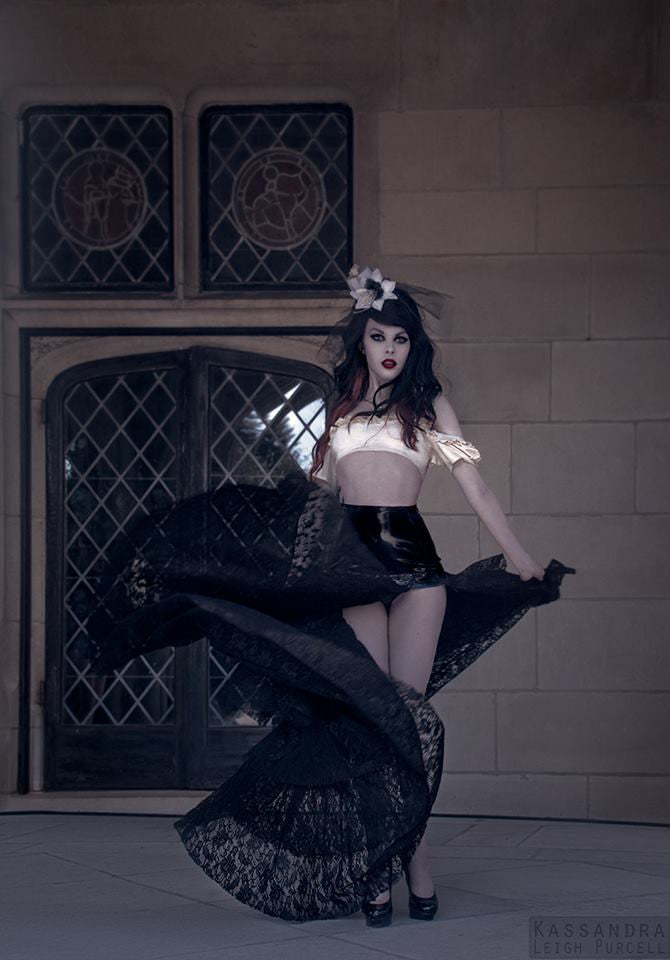 From out new collection, Countess Noir, this top is exotic and feminine, featuring a cute, cropped silhouette with a sweetheart neckline and off the shoulder puff sleeves, finished with a 1/2 ruffle around the top. Laces in the back for closure, but snaps are also available as an option. Shown in white, available in any color